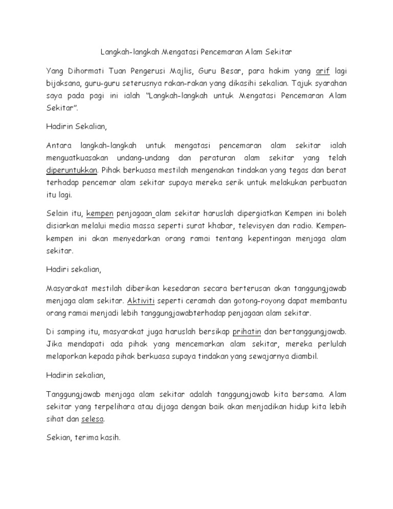 Yang Dihormati Tuan Pengerusi Majlis yang berusaha Tuan Pengetua para hakim yang arif lagi bijaksana guru-guru seterusnya rakan-rakan yang dikasihi sekalianAssalamualaikum dan salam sejahtera. Manakala kemajuan dalam sektor perindustrian telah dikecapi hari ini sedikit tercalar impak daripada sikap manusia yang tidak bertanggungjawab ini. Pemuliharaan alam sekitar adalah tanggungjawab bersama.